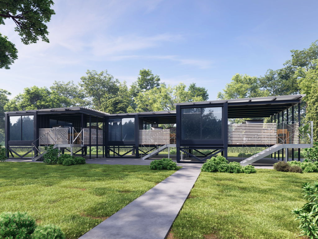 「モジュール化された鉄骨造として、 物流と建築とブランドを一体でデザインできる器」であることです。単なる“安い箱”でも、“おしゃれな箱”でもありません。構造・工場生産・輸送・設置・増設・ブランドづくりまで、一気通貫で設計しやすい点が、コンテナハウスの本当の強みです。